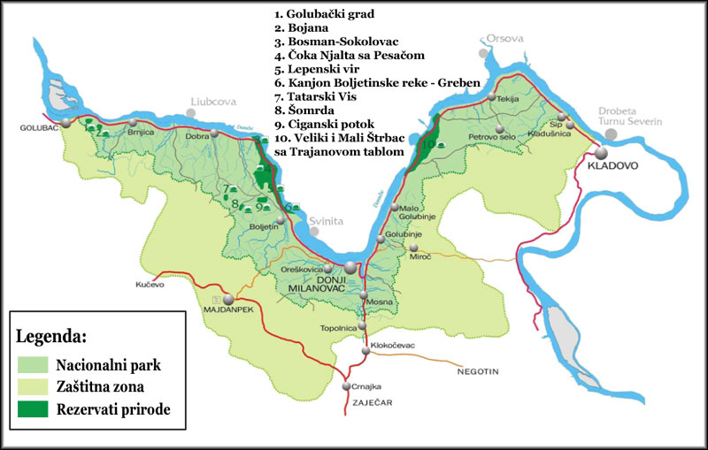(1) „Golubac“, (2) „Bojana“, (3) „Bosman – Sokolovac“, (4) „Čoka Njalta – Pesača“, (5) „Lepenski Vir, (6) „Boljetinska – Greben, (7) „Tatarski vis“, (8) „Šomrda“, (9) „Ciganski potok “, (10) „Veliki i Mali Štrbac“ (11) „Ruđine“ , (12) „Ogašu Kazan“ , (13)„Čoka Kulejaši“, (14) „Golubinska glava“, (15) „Gradašnica“, (16) „Vidikovac – Kovilovo“, (17) „Klisura Brnjice“ i (18) „Tilva Tome“.